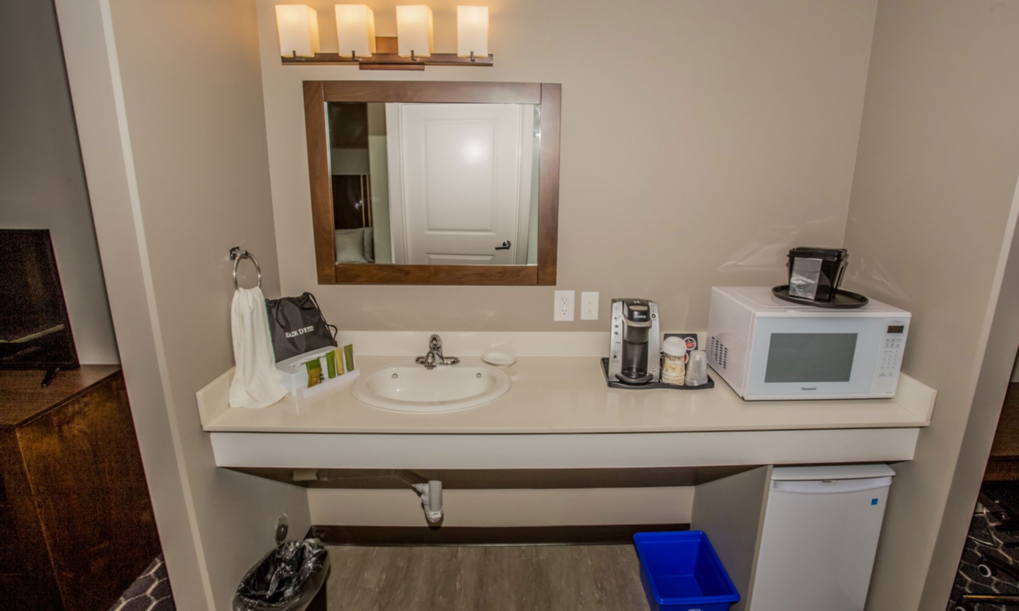 The Souris Hotel has 18 well appointed and unique 2 queen bedded rooms with a focus on privacy. These rooms have a privacy washroom between the beds and have two 39″ Flat screen TV ‘s. The rooms are 415 square feet with 10-foot ceilings, individual heat/air conditioning, neutral colors and European windows with room darkening drapes. They also have a writing table and chair and come with a refrigerator, microwave, and Keurig Coffee makers.